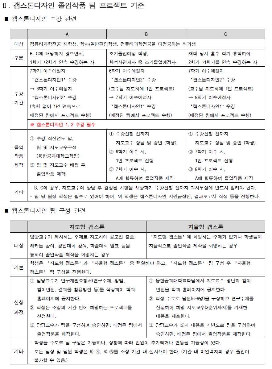 졸업작품 제출(온라인 신청) 방법: ‘캡스톤디자인’을 이수하며 만들어진 결과물의 경우 신청구분을 ‘졸업작품’으로 선택해야 함.